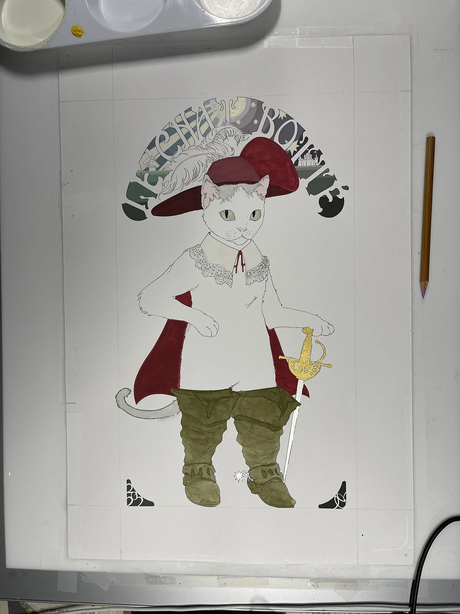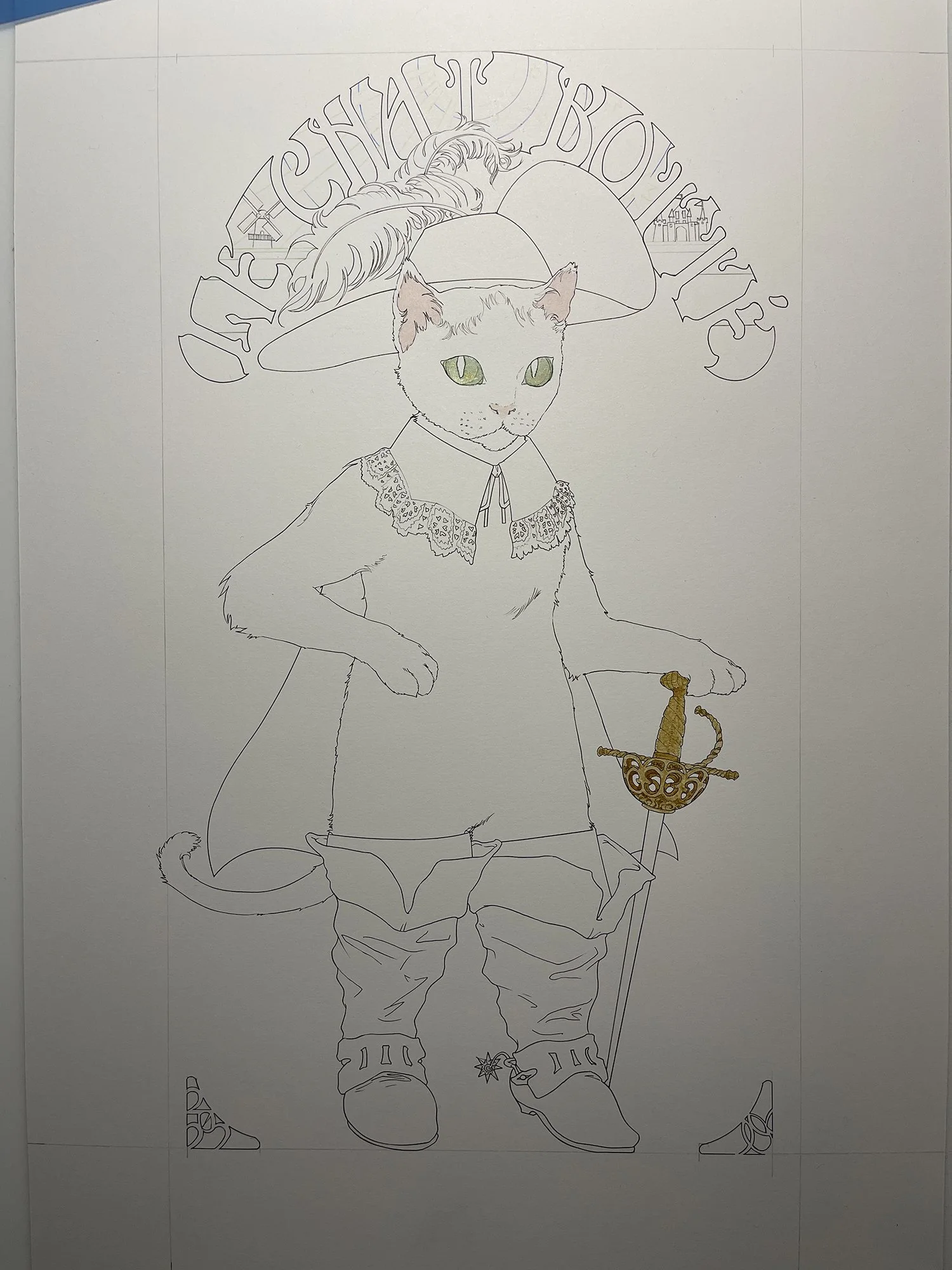 She didn’t ask for a specific style or anything— just sent me several reference photos of her cat, Astro. So I took artistic liberty and decided to draw him dressed as the cat from Puss In Boots or Le Chat Botté as it is known in French.