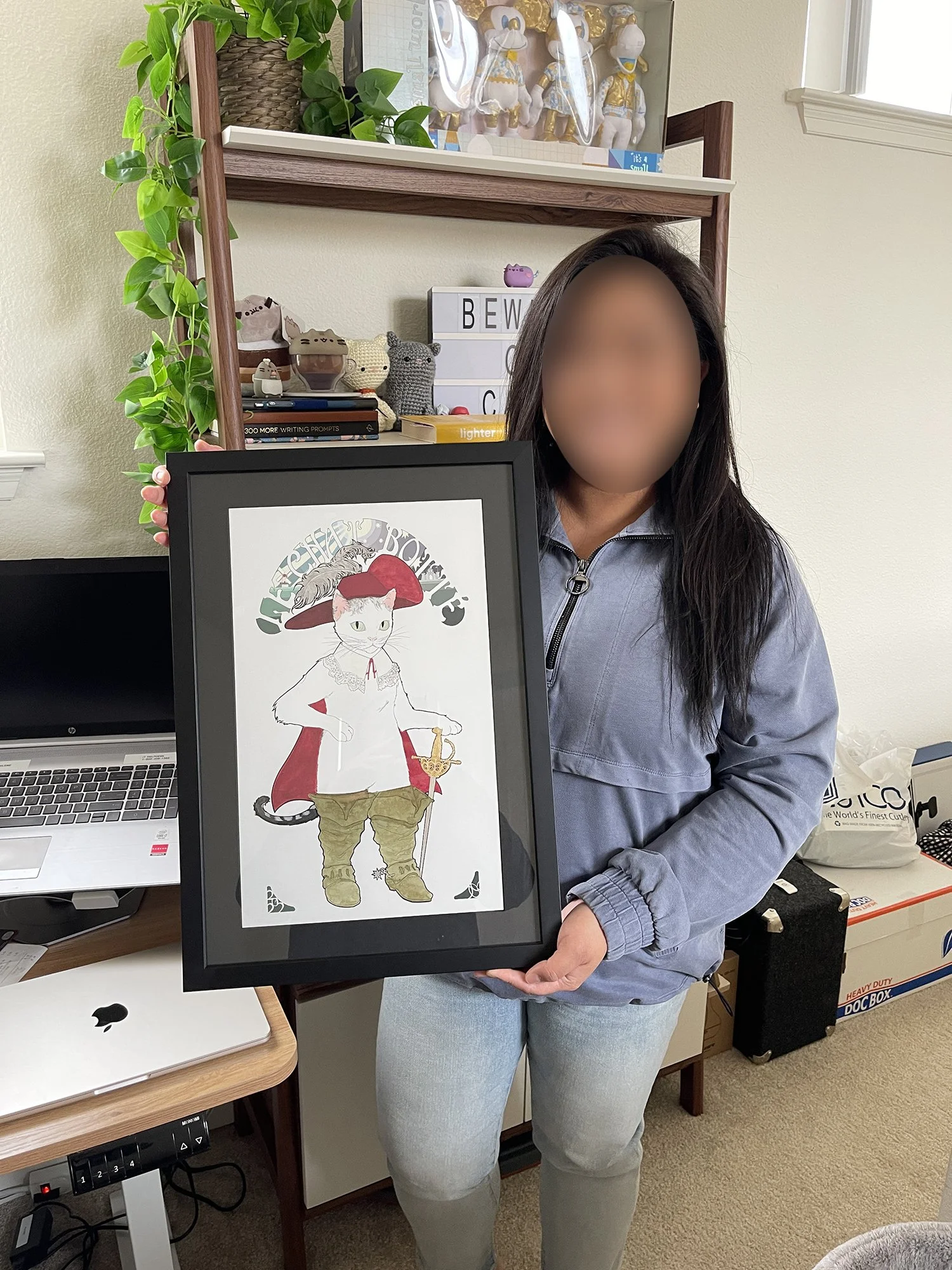My sis holding the framed illustration. Face is censored for privacy.