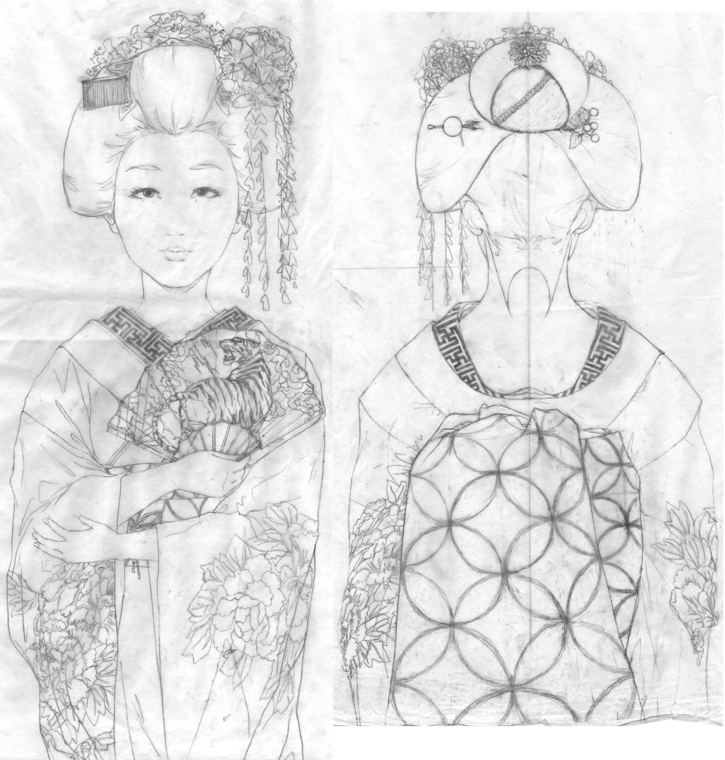 After seeing different versions of the makeup designs on the nape of geisha, I was inspired to create a front-back design. One of the challenges with the work was rendering patterned fabrics, while maintaining the simplicity and “flatness” that I was going for aesthetically. I decided on three color variants for this piece.