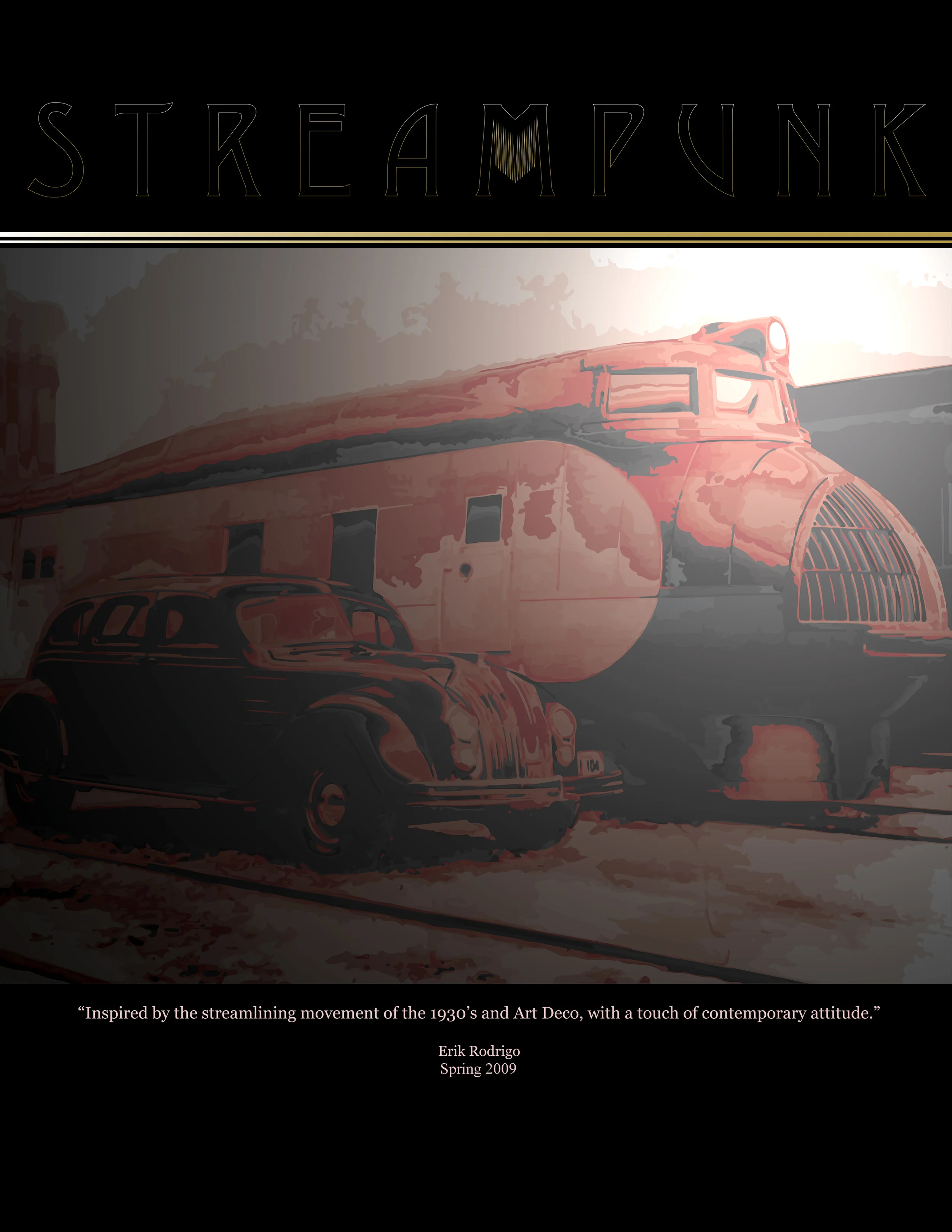 Delving into past historical periods is one way the cycle of fashion keeps turning. Streamlining was a movement in industrial design that coincided with Art Deco's high point in the 1930's. The 1934 Chrysler Airflow was a concept car that provided much of the inspiration for this collection, along with 1930's dress and architecture.